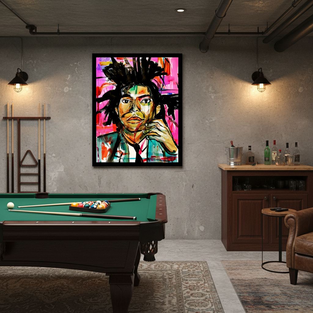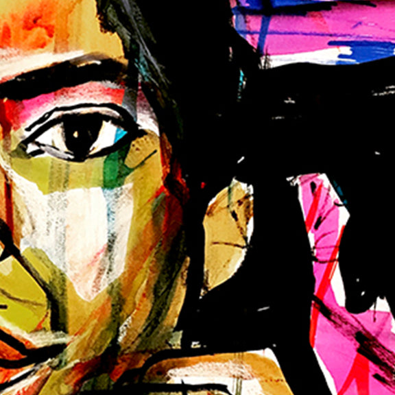 A portrait of an artist famous for his visual and personal style, Jean-Michel Basquiat--now rendered in my style using liquid acrylics, Japanese sumi ink, white charcoal and markers, originally painted on paper live in the front of an audience during my residency at the W Hotel in Union Square, NYC in 2017.