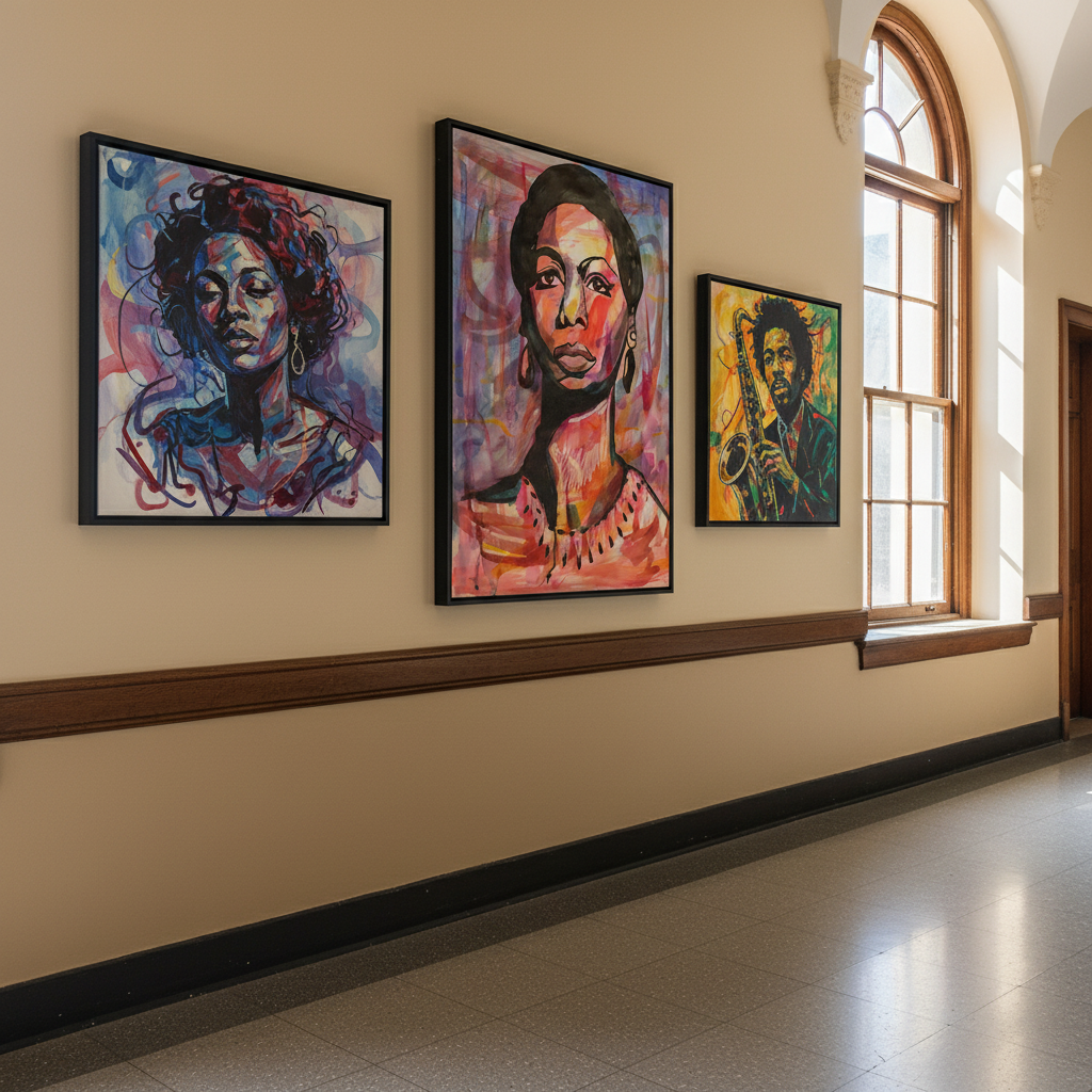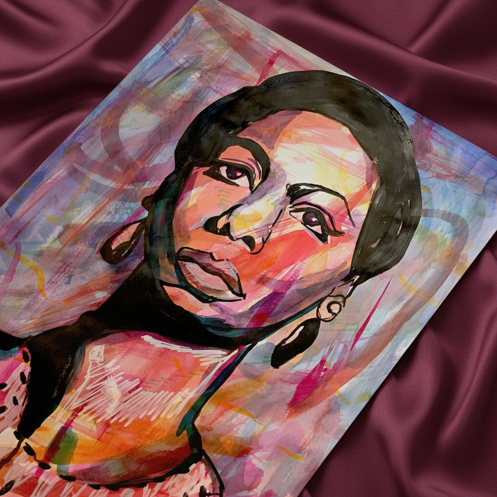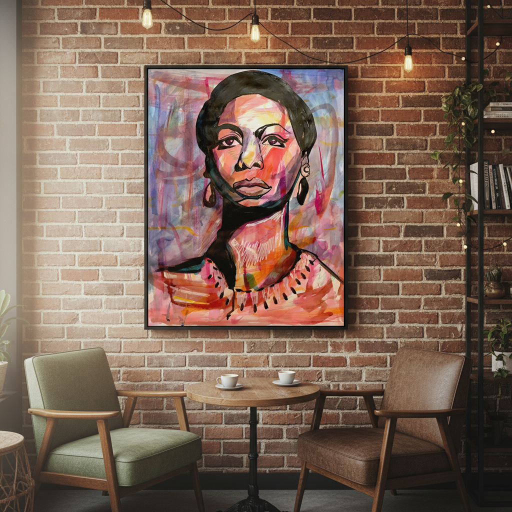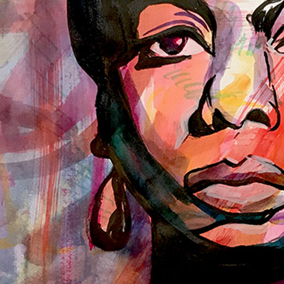 Nina Simone painted as an unbothered woman with her eyes on the prize set apart from the colors swirling in the background. This multi-media painting was made with Japanese sumi ink, white charcoal, and archival color inks.