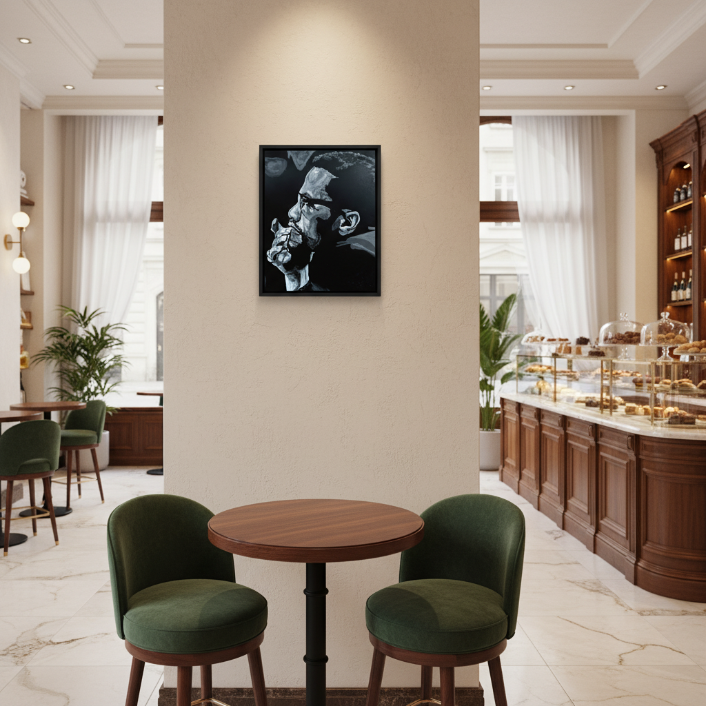 A tribute the late great Malcolm X, reflecting his pensive nature. This is an original work, painted using acrylics and on black stock paper, made in March 2025 in the year he would have turned 100-years old.